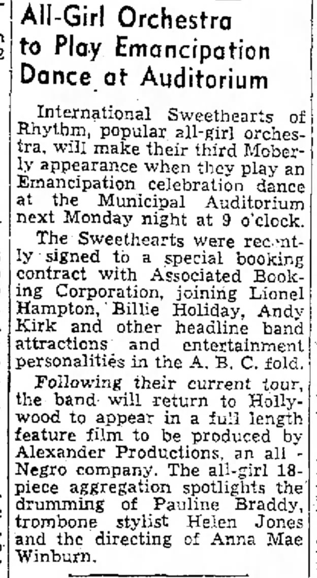 This historical event, reported by the Moberly Monitor-Index and Moberly Evening Democrat, captures a moment of cultural significance and community joy. Preserved by The State Historical Society of Missouri, this narrative reflects the enduring spirit and talent of the International Sweethearts of Rhythm, whose music continues to inspire and uplift.