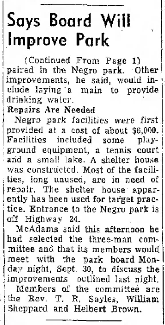 Access to Douglas Negro Park is located off Highway 24. E. H. “Mittie” McAdams announced that he has formed a three-man committee to oversee the park’s rejuvenation. The committee members—the Rev. T. R. Sayles, William Sheppard, and Helbert Brown—will meet with the park board on Monday night, September 30th, to discuss the planned improvements.
