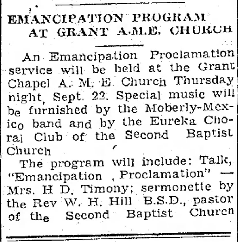 The community of Moberly was abuzz with anticipation as the Grant Chapel A.M.E. Church prepared to host a significant Emancipation Proclamation Service on Thursday night, September 22. This event, announced in the Moberly Monitor-Index and Moberly Evening Democrat, promised an evening of reflection, celebration, and unity.