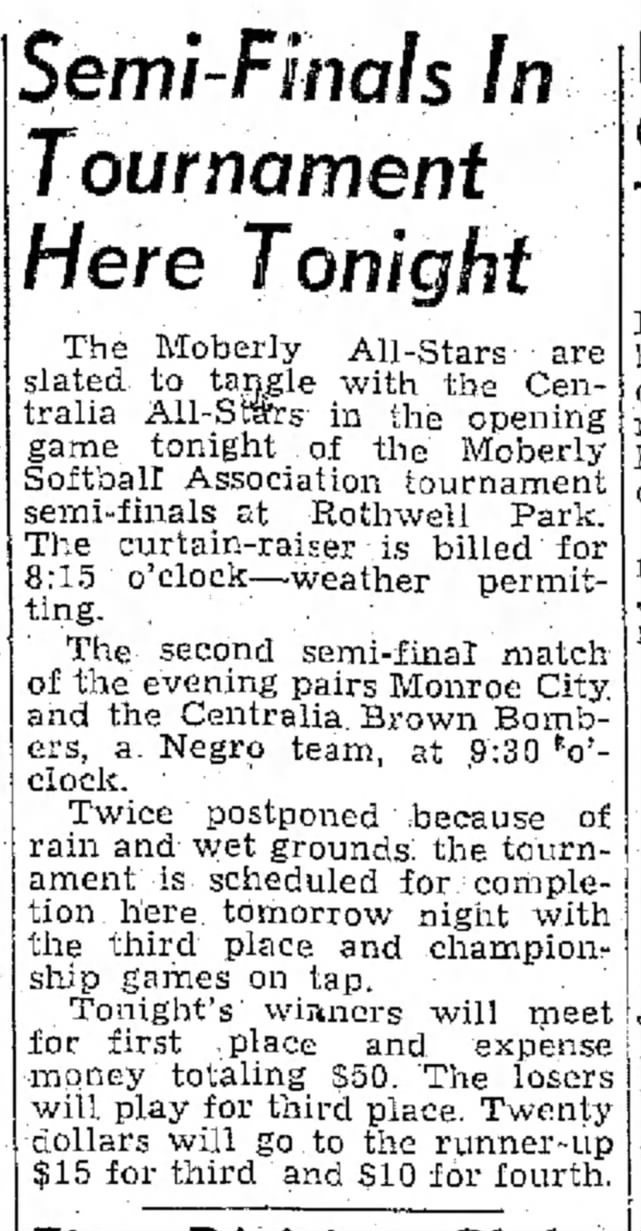 Centralia Brown Bombers Semi-Finals in Tournament, Moberly - Monday, August 30, 1948