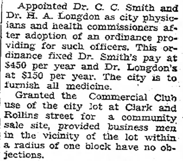 According to an adopted ordinance, Dr. C. C. Smith (for white patients) and Dr. H. A. Longdon (for negro patients) have been appointed as city physicians and health commissioners for Moberly. This new ordinance stipulates an annual salary of $450 for Dr. Smith and $150 for Dr. Longdon, with the city providing all necessary medicine. Their appointments are a step towards enhancing public health management in our community.