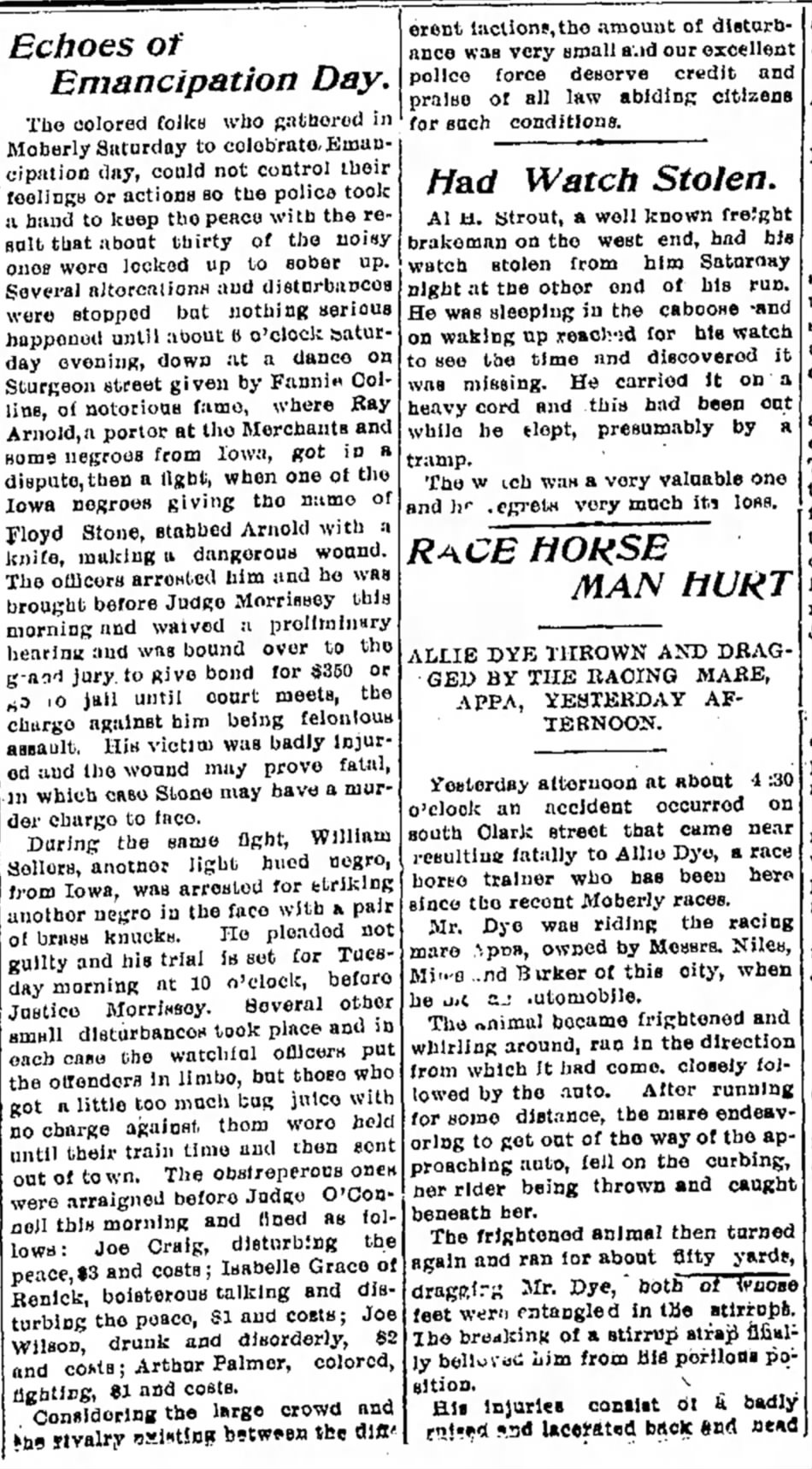 At approximately 5 o’clock in the evening, a dance held on Sturgeon Street by the infamous Fannie Collins became the scene of a violent confrontation. Ray Arnold, a porter at the Merchants, got into a heated argument with some visiting negroes from Iowa. The dispute escalated into a fight, culminating in one of the Iowa visitors, who identified himself as Floyd Stone, stabbing Arnold with a knife and inflicting a severe wound. Stone was promptly arrested and brought before Judge Morrissey. He waived a preliminary hearing and was bound over to the grand jury with a bond set at $350. If unable to post bail, he would remain in jail until court convened, facing a charge of felonious assault. Given the seriousness of Arnold’s injury, which could prove fatal, Stone might eventually face a murder charge.