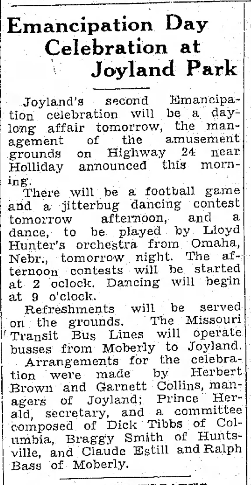 The celebration has been organized by Herbert Brown and Garnett Collins, managers of Joyland, along with Prince Herald, the secretary, and a dedicated committee. The committee members include Dick Tibbs of Columbia, Braggy Smith of Huntsville, and Claude Estill and Ralph Bass of Moberly.