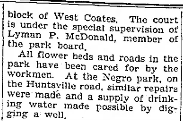 Equally significant were the upgrades made to the Negro Park on Huntsville Road. This park, which had long served as a recreational area for Moberly’s Negro community, saw substantial repairs. The most notable improvement was the digging of a new well, a development that promised a steady and reliable supply of drinking water for all visitors. This enhancement underscored the city’s commitment to providing essential amenities and improving the quality of life for its residents.