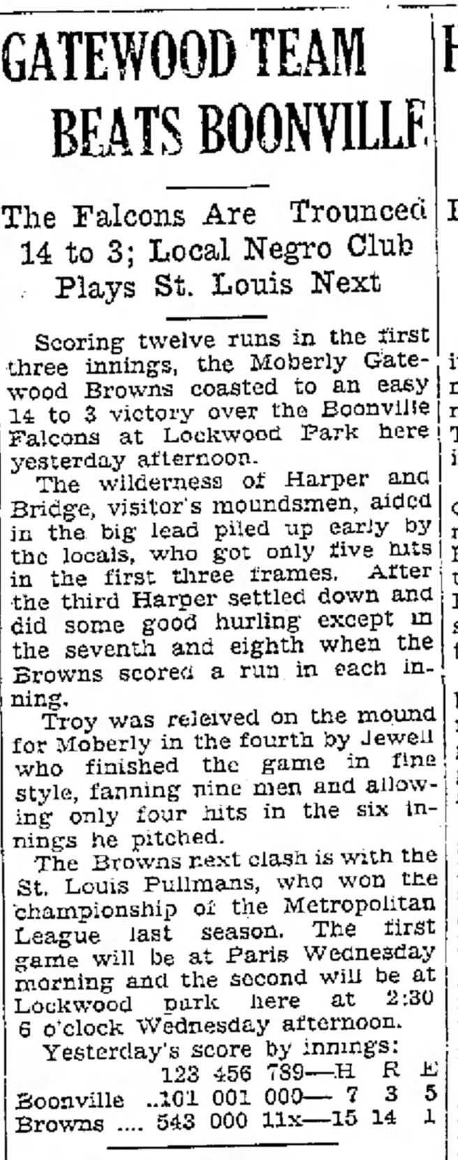 In a dazzling display of skill and strategy, the Moberly Gatewood Browns secured a commanding 14-3 victory over the Boonville Falcons yesterday afternoon at Lockwood Park. The game, part of the local Emancipation Day celebrations, saw the Browns scoring twelve runs in the first three innings, effectively coasting to an easy win.