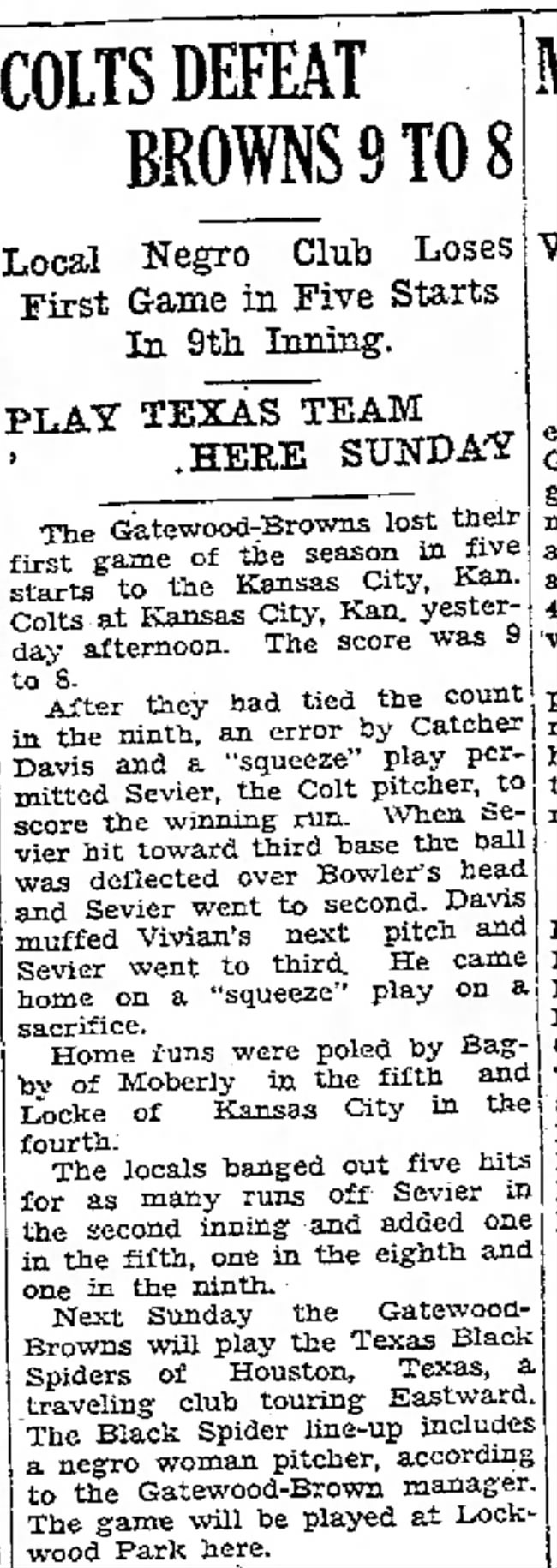 Yesterday afternoon, the Moberly Gatewood-Browns suffered their first defeat of the season after five consecutive victories. The Kansas City, Kansas Colts clinched a narrow 9 to 8 win, seizing the opportunity presented by a ninth-inning error by Catcher Davis and executing a flawless “squeeze” play.