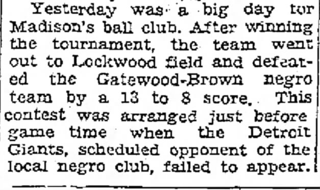 Yesterday marked a triumphant day for Madison’s ball club. Fresh off their tournament victory, the team headed to Lockwood Field and took on the Gatewood-Browns, a local Negro team, securing a 13 to 8 win. This unexpected contest came about just before game time when the Detroit Giants, the scheduled opponents for the Gatewood-Browns, failed to appear.