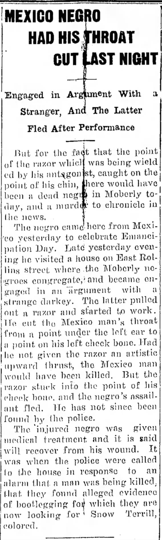 The normally celebratory atmosphere of Emancipation Day was marred by a violent altercation last night, involving a man who had traveled from Mexico, Missouri, to join the festivities. The incident took place at a house on East Rollins Street, a known gathering spot for Moberly’s African American community.
