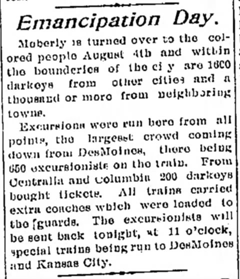 On August 4th, Moberly welcomed around 1,600 colored people from other cities and an additional thousand from nearby towns for the Emancipation Day celebration. Excursions were organized from various locations, with the largest group of 650 people arriving from Des Moines. Around 200 participants came from Centralia and Columbia.