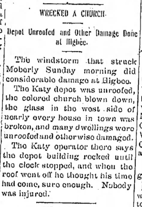 The windstorm that swept through Moberly on Sunday morning caused significant damage in Higbee. The Katy depot was unroofed, the colored church was blown down, and the glass in the west side of nearly every house in town was shattered. Additionally, many dwellings were unroofed and otherwise damaged.