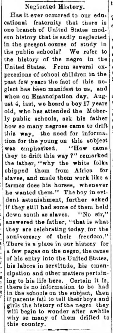 Have you ever considered that there’s a significant portion of modern United States history that’s overlooked in our public school curriculum? Specifically, the history of the Negro in the United States. This neglect has become apparent through the remarks of school children over the past few years. The urgency of this gap was underscored on Emancipation Day, August 4th, when a 17-year-old boy, who had attended the Moberly public schools, asked his father how so many Negroes came to be here.