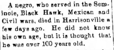 A man who served in the Seminole, Black Hawk, Mexican, and Civil wars recently passed away in Harrisonville. He was of African descent and did not know his own age, though it is believed he was over 100 years old.