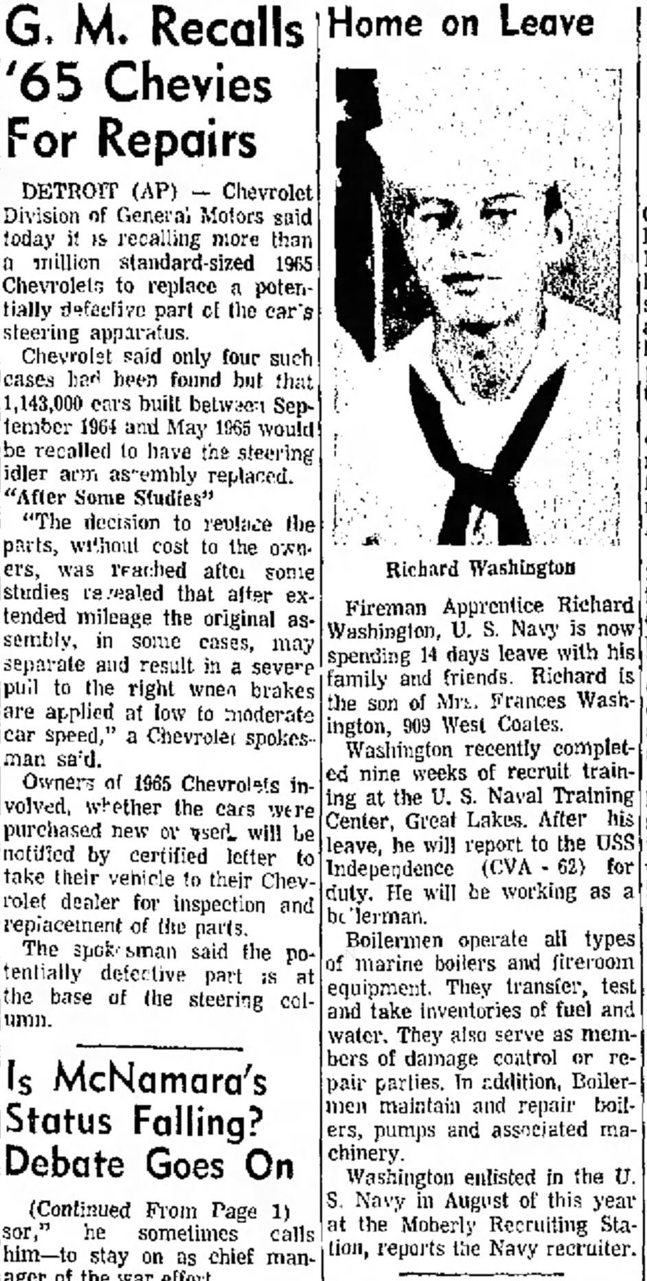 Fireman Apprentice Richard Washington, U.S. Navy, is spending 14 days of leave with his family and friends. Richard is the son of Mrs. Frances Washington, who lives at 909 West Coates. He recently completed nine weeks of recruit training at the U.S. Naval Training Center in Great Lakes.