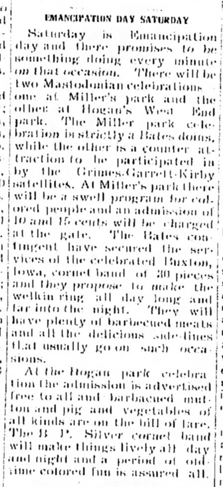 The event at Miller’s Park, organized by the Bates faction, promises a vibrant program for the colored community. With an admission fee of 10 and 15 cents, attendees can expect a day filled with lively entertainment. The renowned Baston, Iowa, cornet band, boasting 20 pieces, will keep the atmosphere buzzing with music from morning until night. The celebration will also feature an array of barbecued meats and a variety of delicious side dishes, offering a true feast for all who attend.