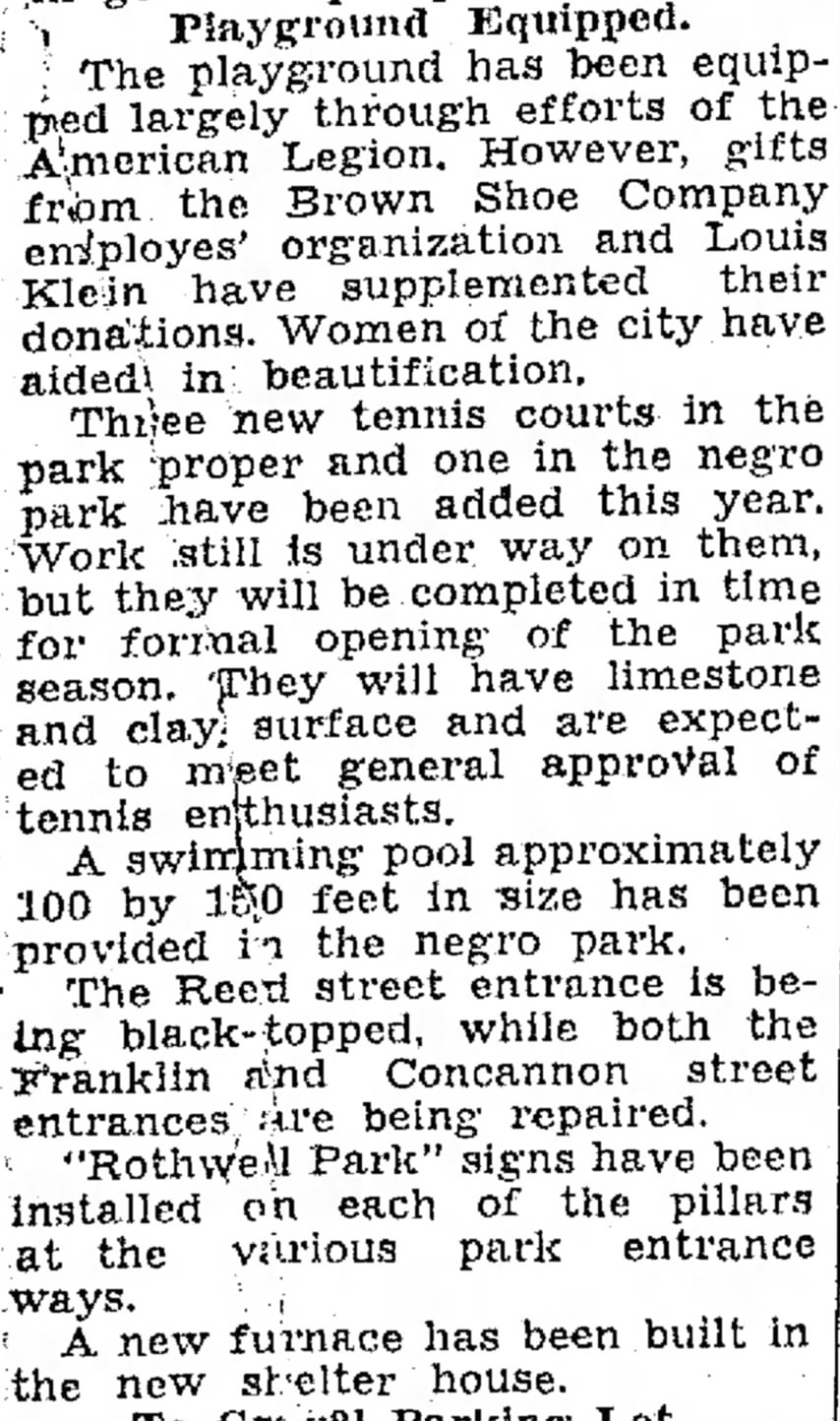 The playground at the Negro Park has seen major upgrades, largely due to the dedicated efforts of the American Legion. Additional contributions from the Brown Shoe Company employees’ organization and local benefactor Louis Klein have further supported these developments. The women of Moberly have also played a crucial role in beautifying the area, contributing to the park’s renewed vibrancy.