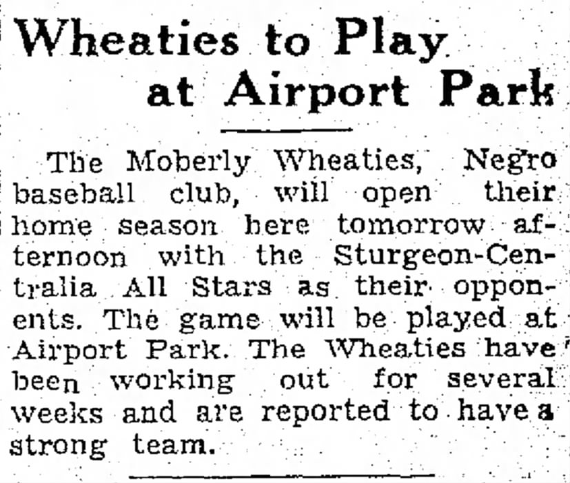 The Moberly Wheaties, a formidable Negro baseball club, are gearing up to kick off their home season with an exciting game against the Sturgeon-Centralia All-Stars. This much-anticipated match will take place at Airport Park.