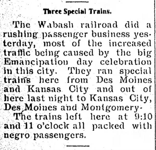 The Wabash railroad hummed with unusual vigor, its platforms crowded with passengers eager for the journey ahead. Yesterday’s Emancipation Day celebration had transformed Moberly into a hub of activity, with the railroad bearing witness to a surge of travelers, their hearts buoyed by the day’s significance.
